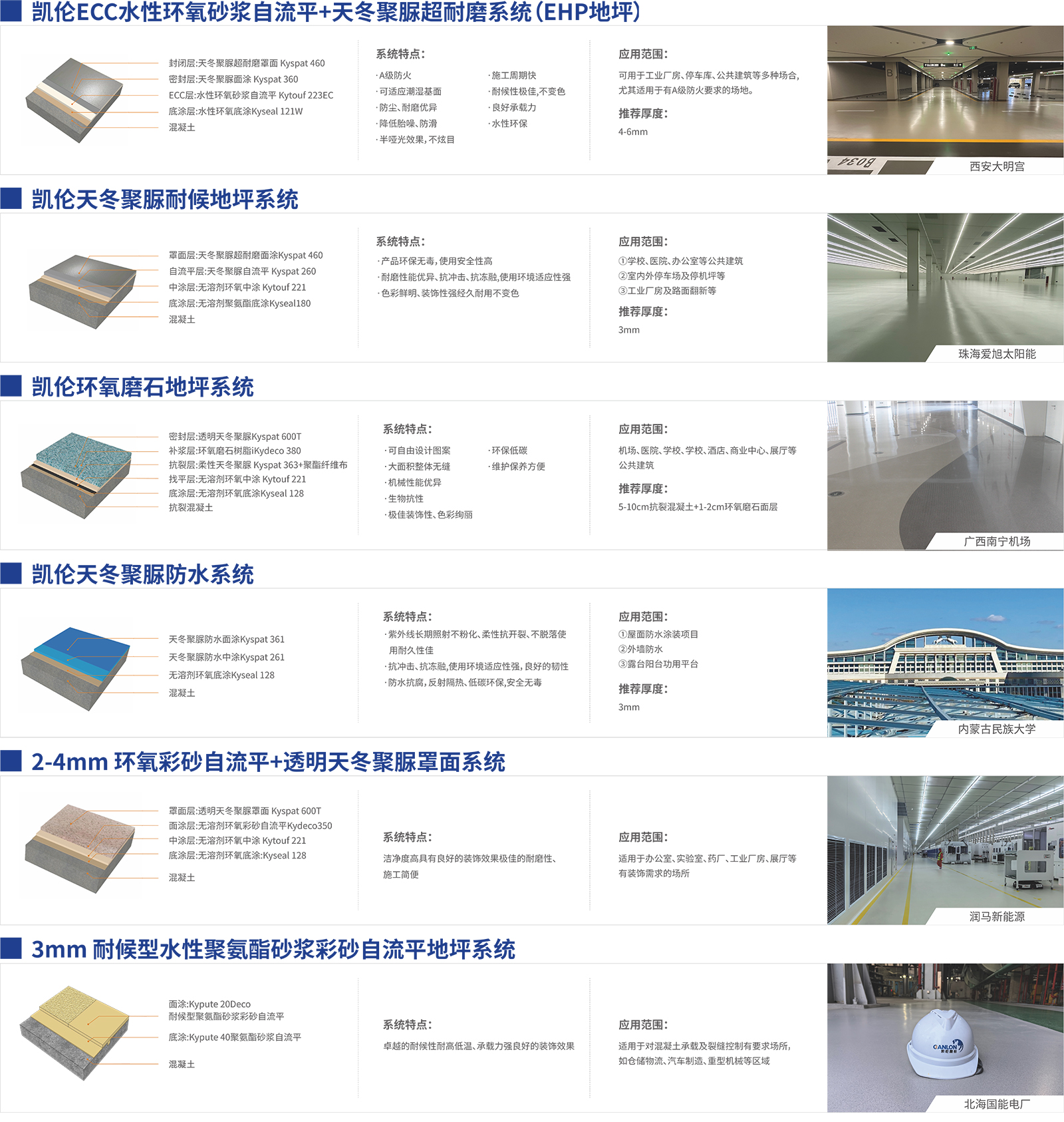 凱倫股份地坪解決方案根據使用者要求和不同使用環(huán)境的特點而提出。作為地坪行業(yè)系統(tǒng)化服務商,我們一直把綠色、環(huán)保作為企業(yè)的精神旗幟,在研發(fā)、生產、和施工的過程中身體力行,保證所使用的地坪材料均為無溶劑產品或者水性產品,用行動引領地坪材料的發(fā)展未來。