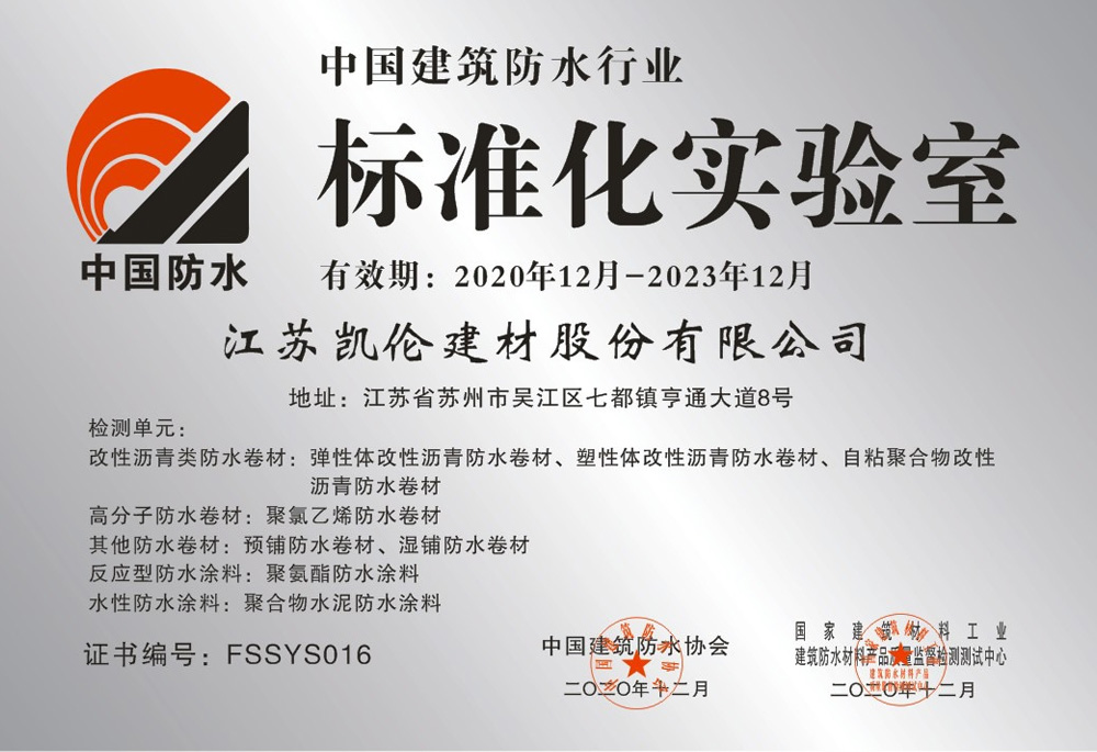 建筑防水行業(yè)標(biāo)準(zhǔn)化實驗室,由中國建筑防水協(xié)會和國家建筑材料工業(yè)建筑防水材料產(chǎn)品質(zhì)量監(jiān)督檢驗檢測中心聯(lián)合評定,通過對實驗室人員資質(zhì)、檢驗設(shè)備、檢驗方法、產(chǎn)品對比試驗等項目的綜合考評,各項分值達(dá)標(biāo)后方可通過。標(biāo)準(zhǔn)化實驗室,是對企業(yè)生產(chǎn)研發(fā)水平的肯定。